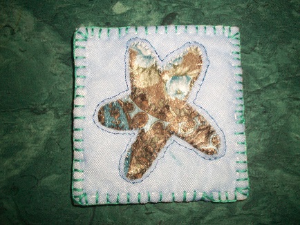 felt, blue netting velvet paisley. threads are regular sewing thread, metallic embroidery thread and crochet cotton thread