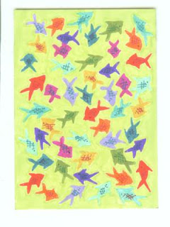 School 45- ATC Sharpies on recycled greeting card. There is no doubt there are 45 fishes in this school cause there's 5 of each color and there are 9 colors of fish. Please feel free to check on those statistics cause I very well could be totally wrong on all that. Counting is NOT my strong suit! Regardless though, how many fishes are there...this card is still called School 45.