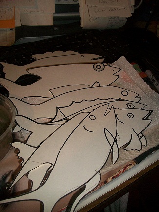 This afternoon I added a coat of gesso to the backsides to give me the same surface as the front side is and to give the fishes a bit more substance.